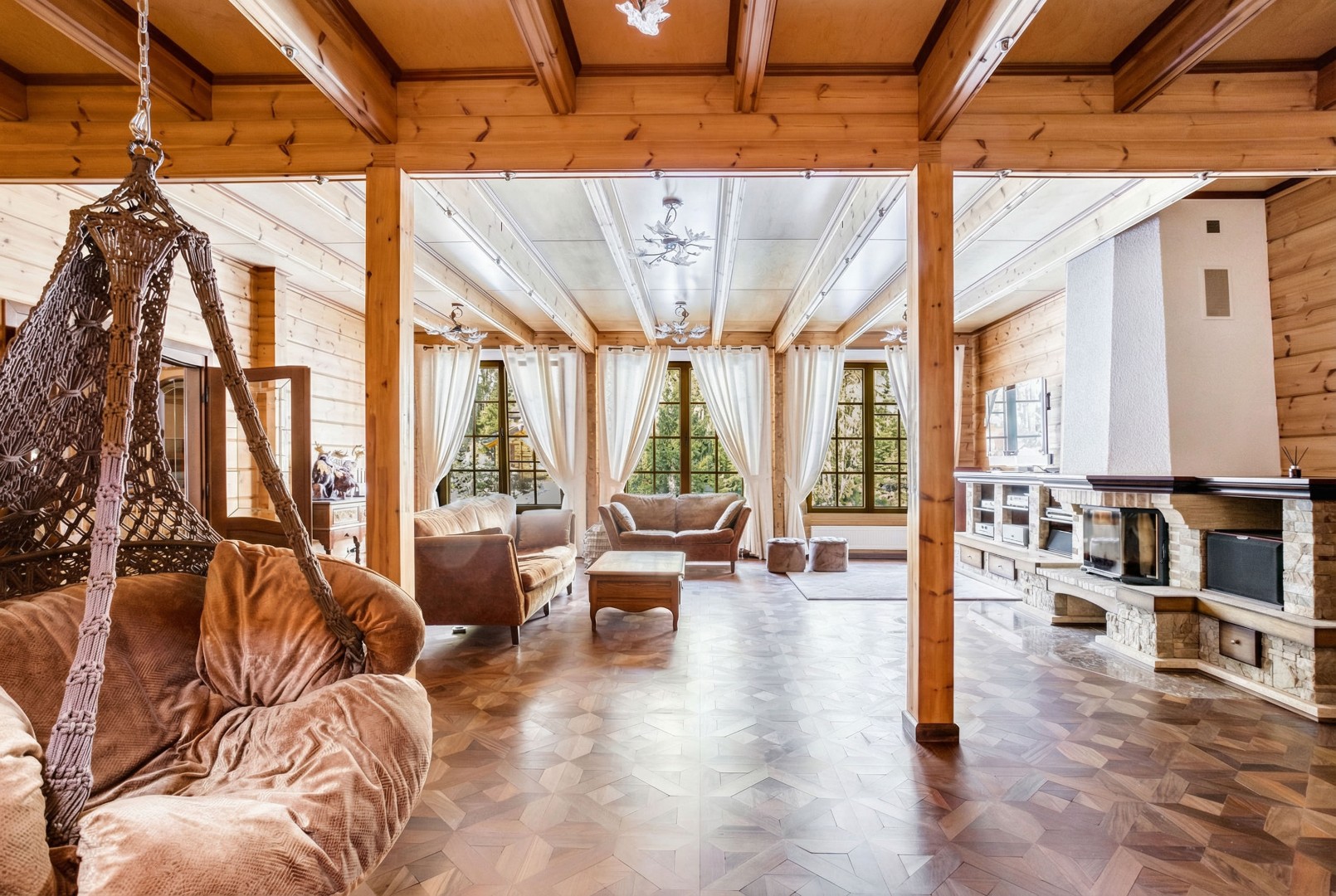 1 этаж: холл, каминный зал с вторым светом, кухня с выходом на террасу и зону барбекю, кабинет, гостевая спальня, санузел, постирочная.