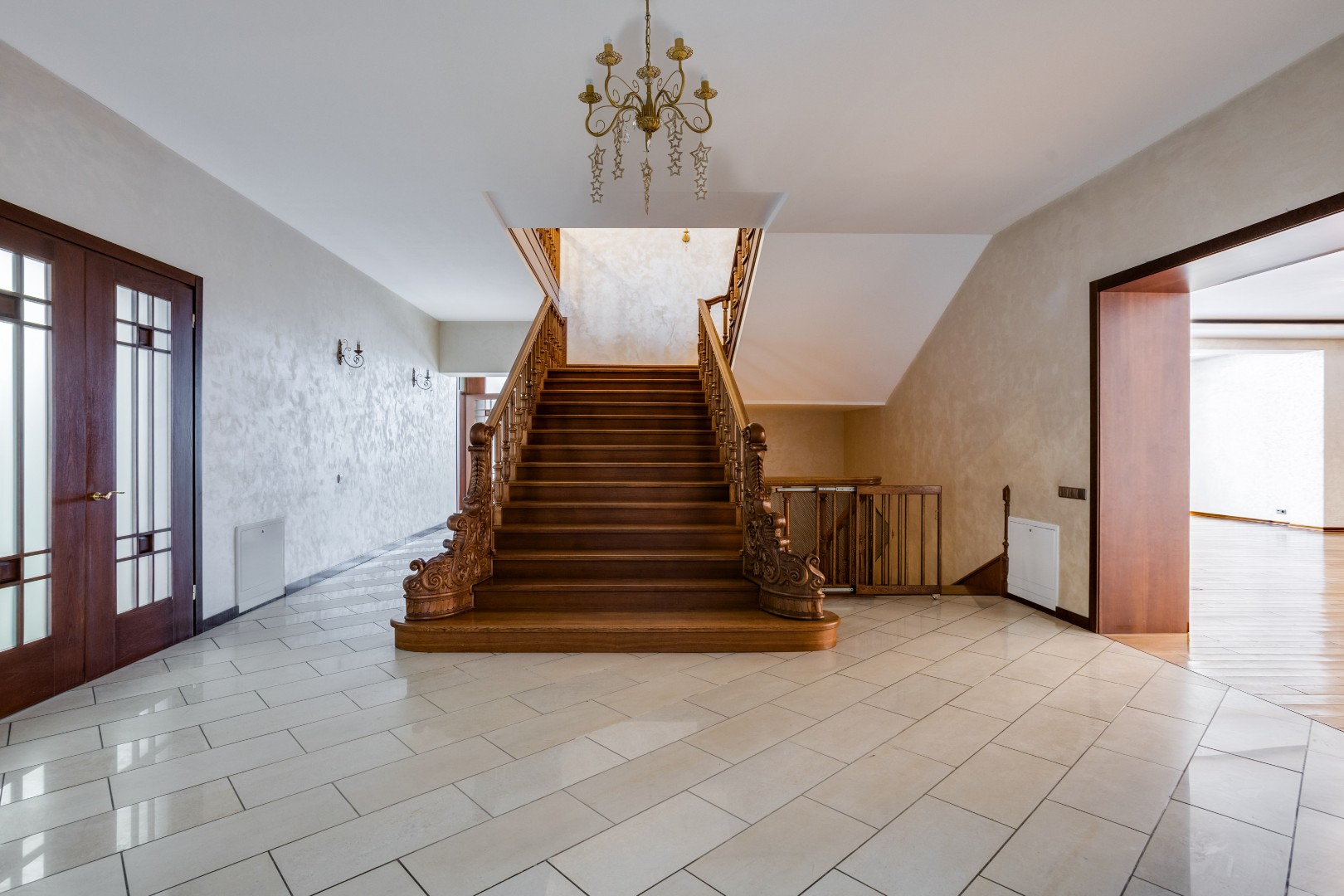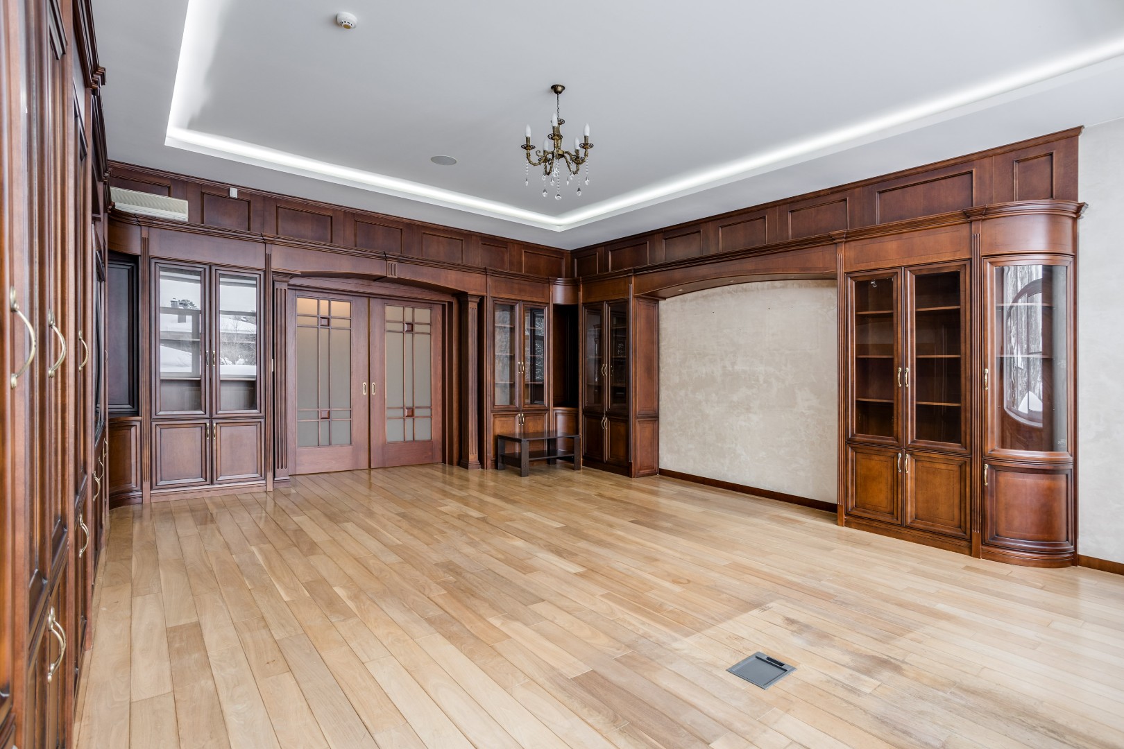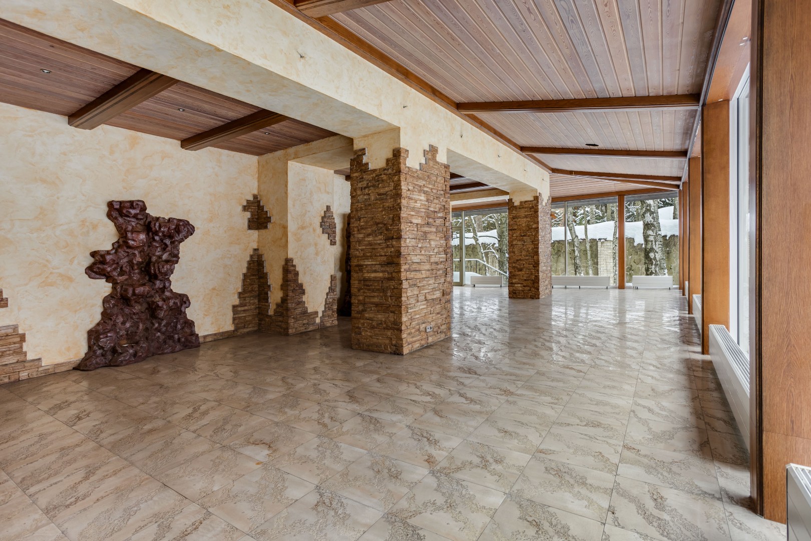 В доме выполнена отделка по индивидуальному проекту, в классическом стиле с использованием теплых оттенков, фактуры камня и дерева. Благодаря большим окнам в пол пространство наполнено воздухом и светом. Цокольный этаж предусматривает отдельные помещения для персонала. Все коммуникации - центральные: газоснабжение, электроснабжение, холодное водоснабжение, канализация. В собственности резидентов — 9 гектаров леса с прогулочными дорожками и велодорожками, зонами барбекю и приватными рекреационными пространствами.
