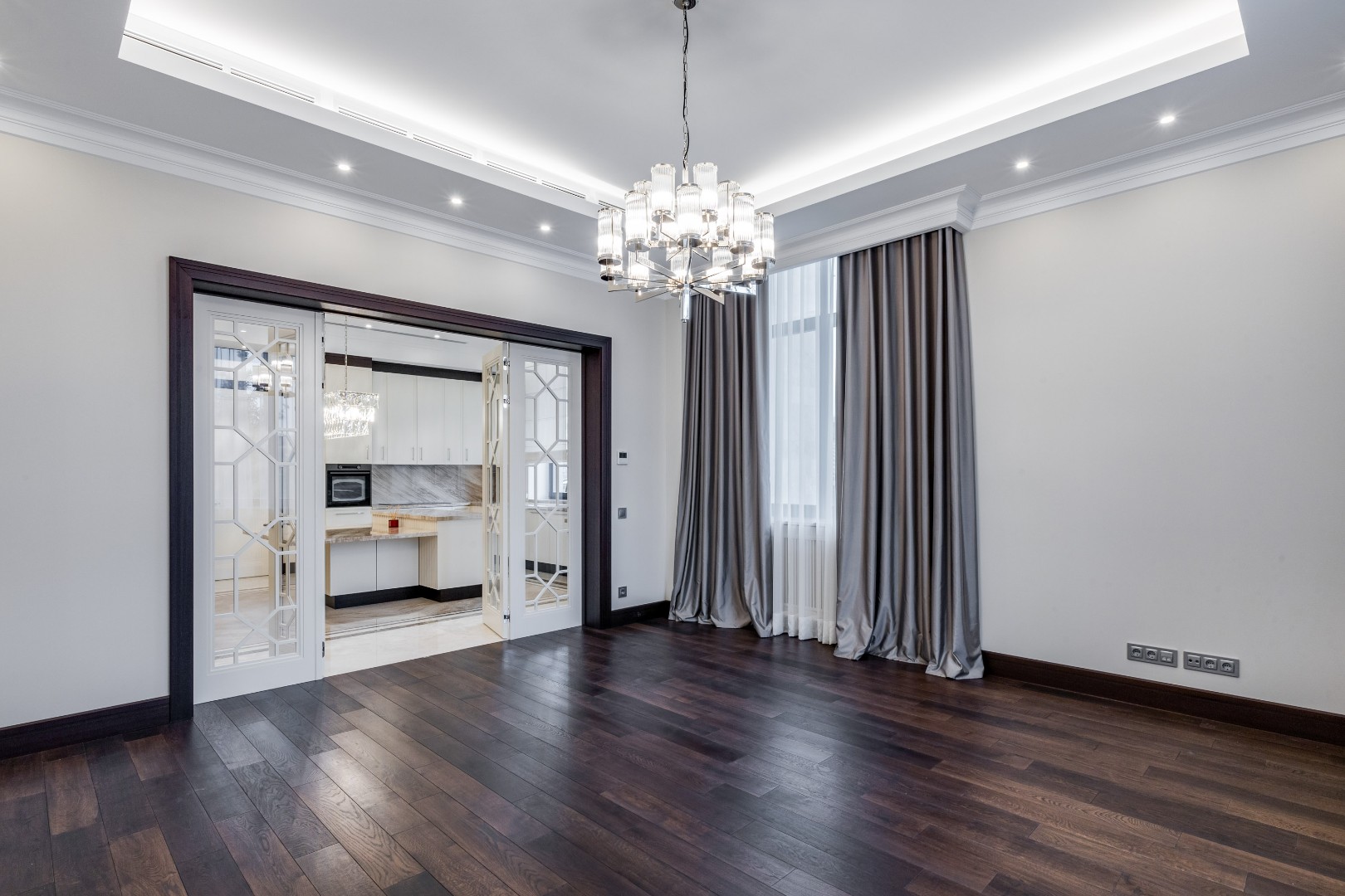 1 этаж: просторный холл, гардеробная, гостевой санузел, светлая и стильная гостиная с высоким потолком и выходом на террасу, элегантная столовая, уютный кабинет с отдельным выходом на участок, изысканная спальня с гардеробной и санузлом, а также выходом на террасу, функциональная кухня с рабочей зоной, постирочная.