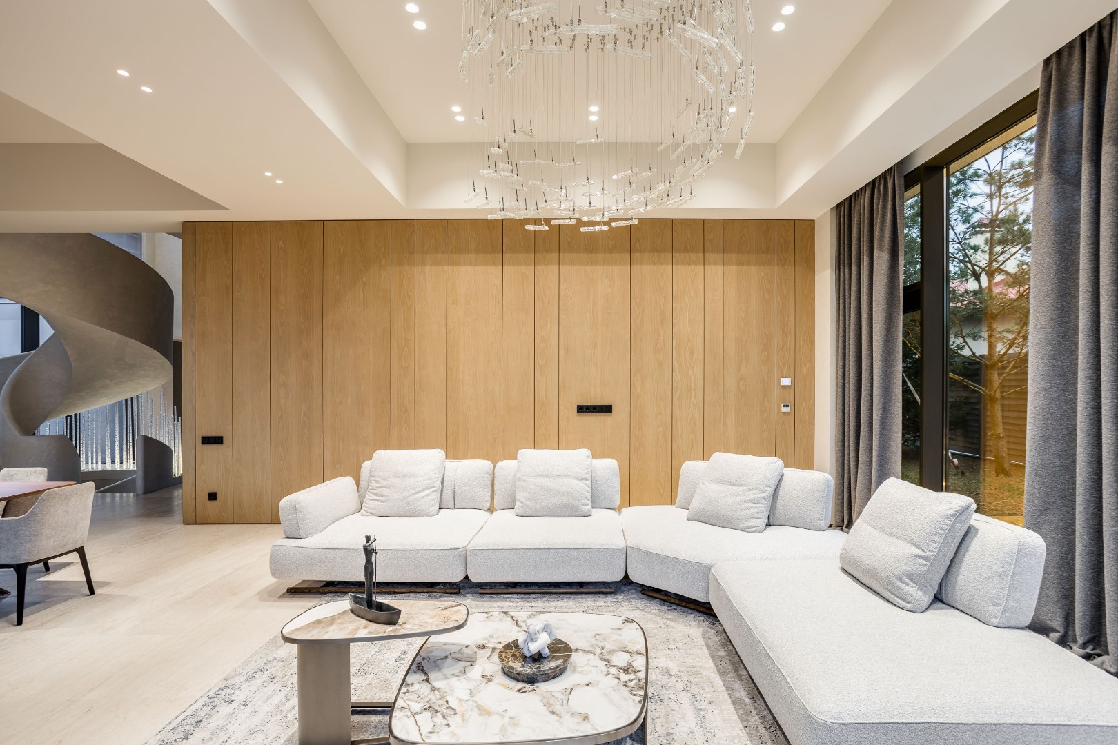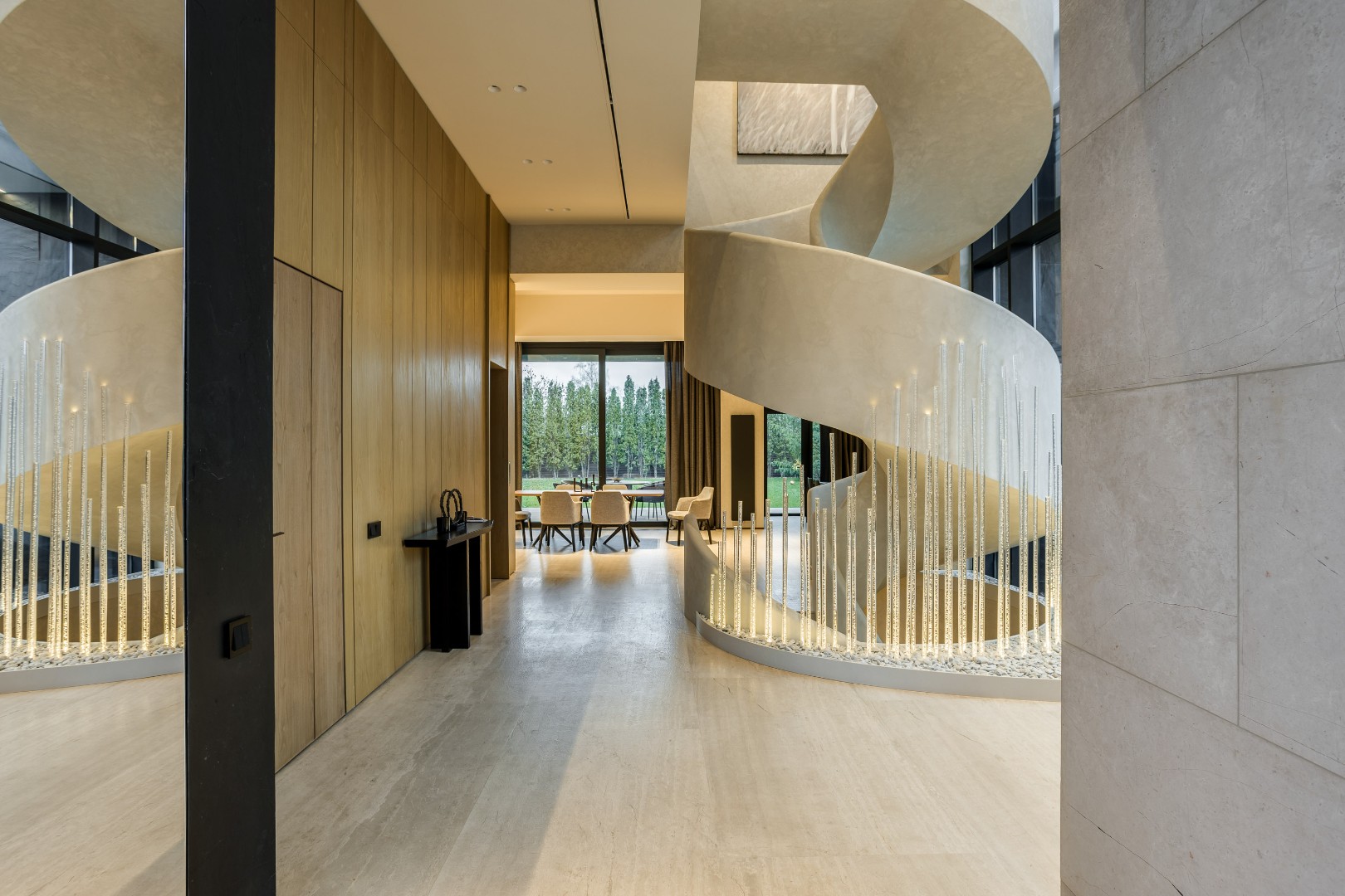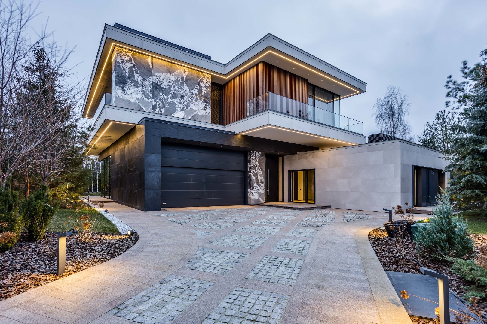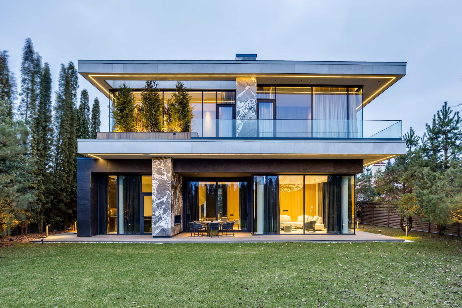Современный дом площадью 663 м² на участке 12,5 сотки в престижном закрытом посёлке "Усово Плюс". Планировка сочетает открытые светлые зоны для жизни и уединённые приватные пространства. В отделке интерьера использованы преимущественно натуральные материалы: натуральный камень, на стенах панели из шпона и текстиля, фактурная декоративная штукатурка. Из панорамных окон открывается вид на приватный и благоустроенный внутренний двор.