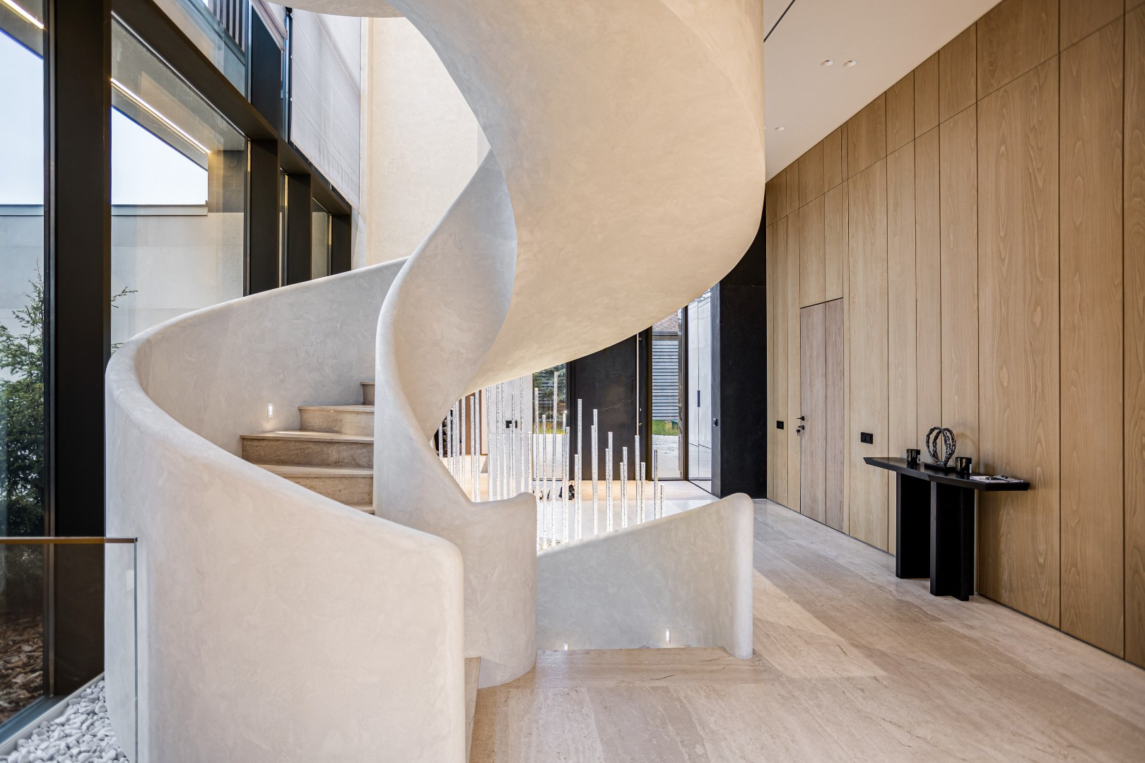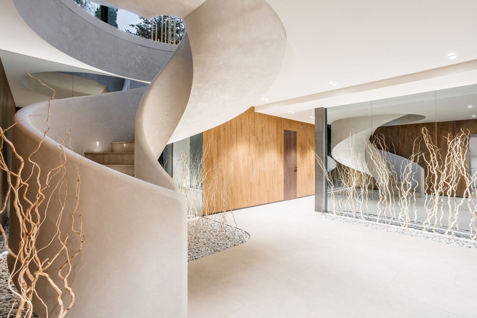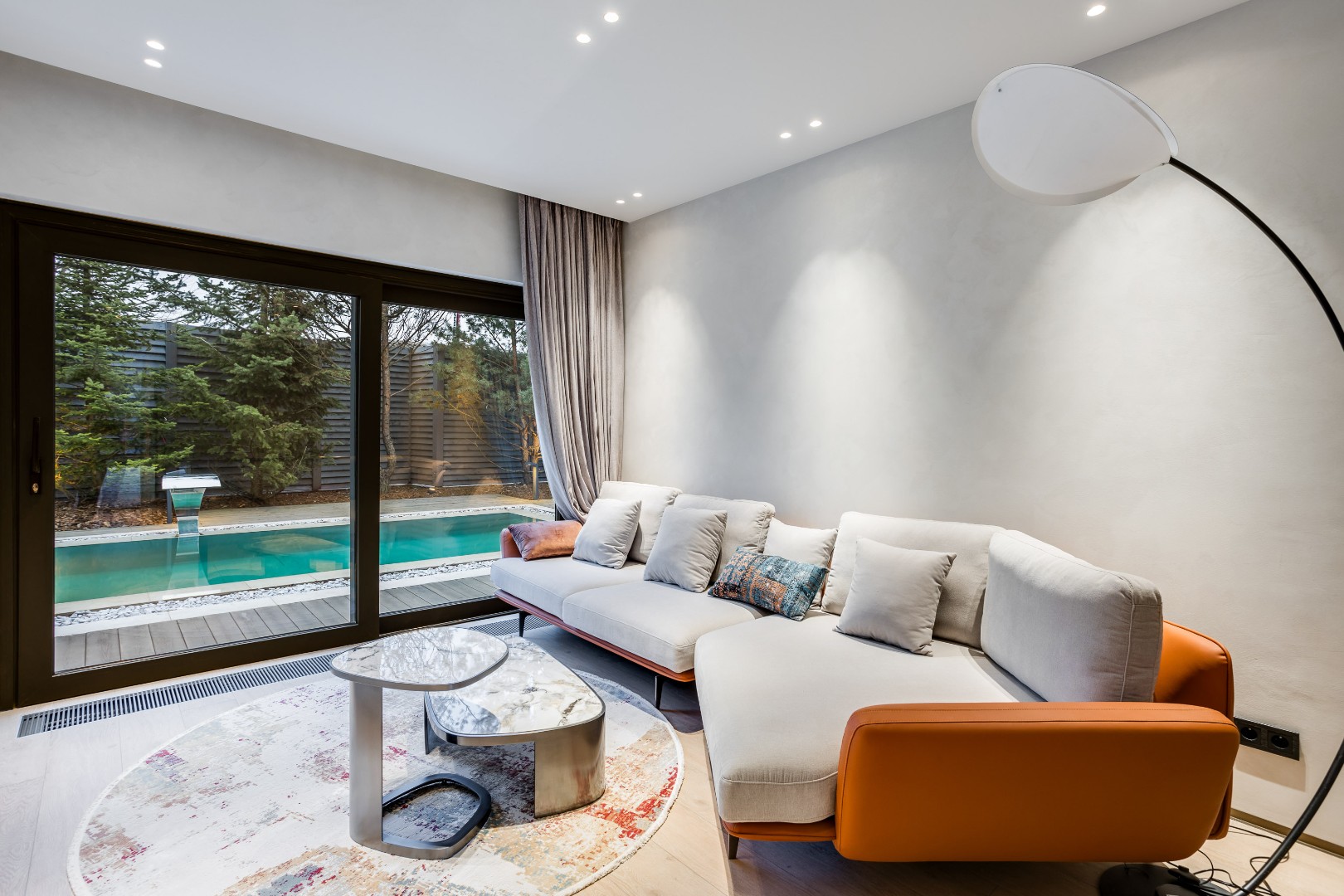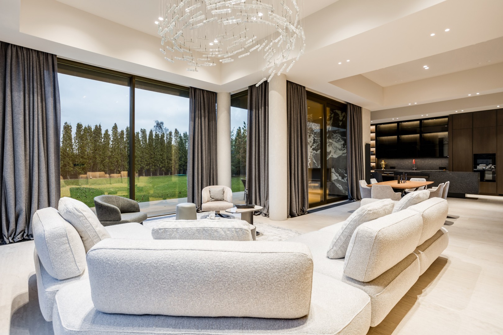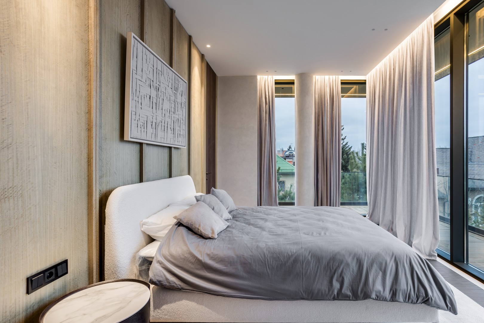 Современный дом площадью 663 м² на участке 12,5 сотки в престижном закрытом посёлке "Усово Плюс". Планировка сочетает открытые светлые зоны для жизни и уединённые приватные пространства. В отделке интерьера использованы преимущественно натуральные материалы: натуральный камень, на стенах панели из шпона и текстиля, фактурная декоративная штукатурка. Из панорамных окон открывается вид на приватный и благоустроенный внутренний двор.