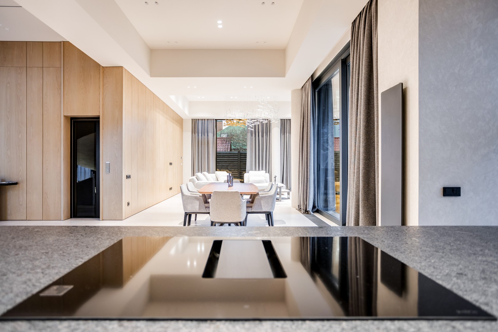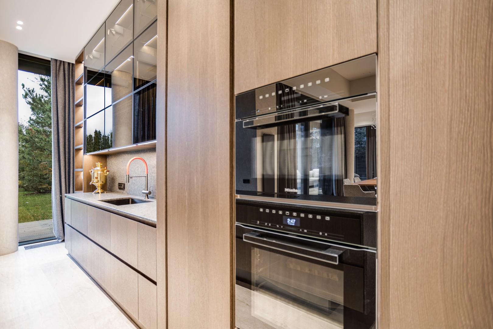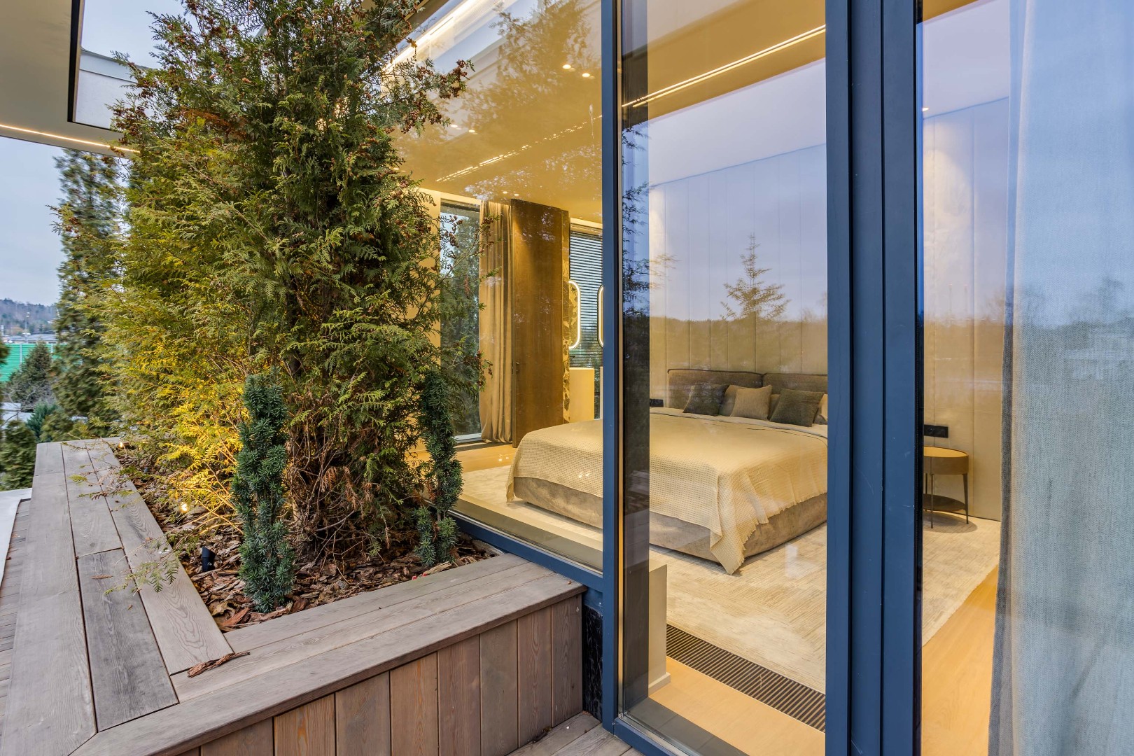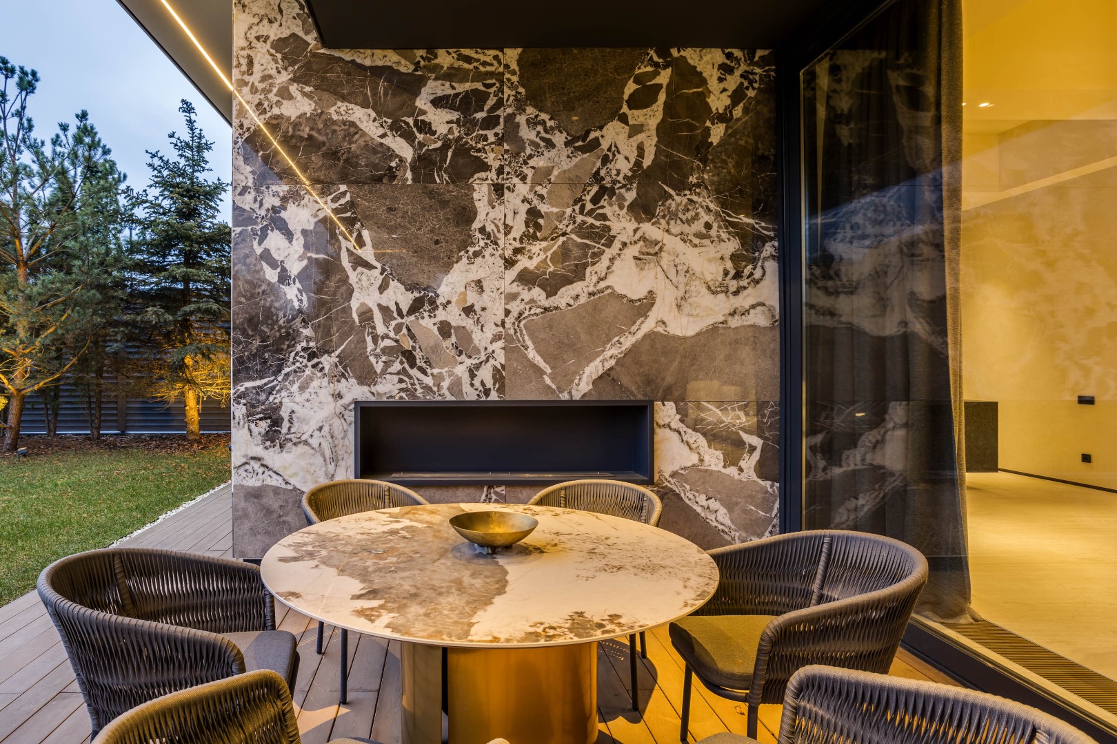 Современный дом площадью 663 м² на участке 12,5 сотки в престижном закрытом посёлке "Усово Плюс". Планировка сочетает открытые светлые зоны для жизни и уединённые приватные пространства. В отделке интерьера использованы преимущественно натуральные материалы: натуральный камень, на стенах панели из шпона и текстиля, фактурная декоративная штукатурка. Из панорамных окон открывается вид на приватный и благоустроенный внутренний двор.