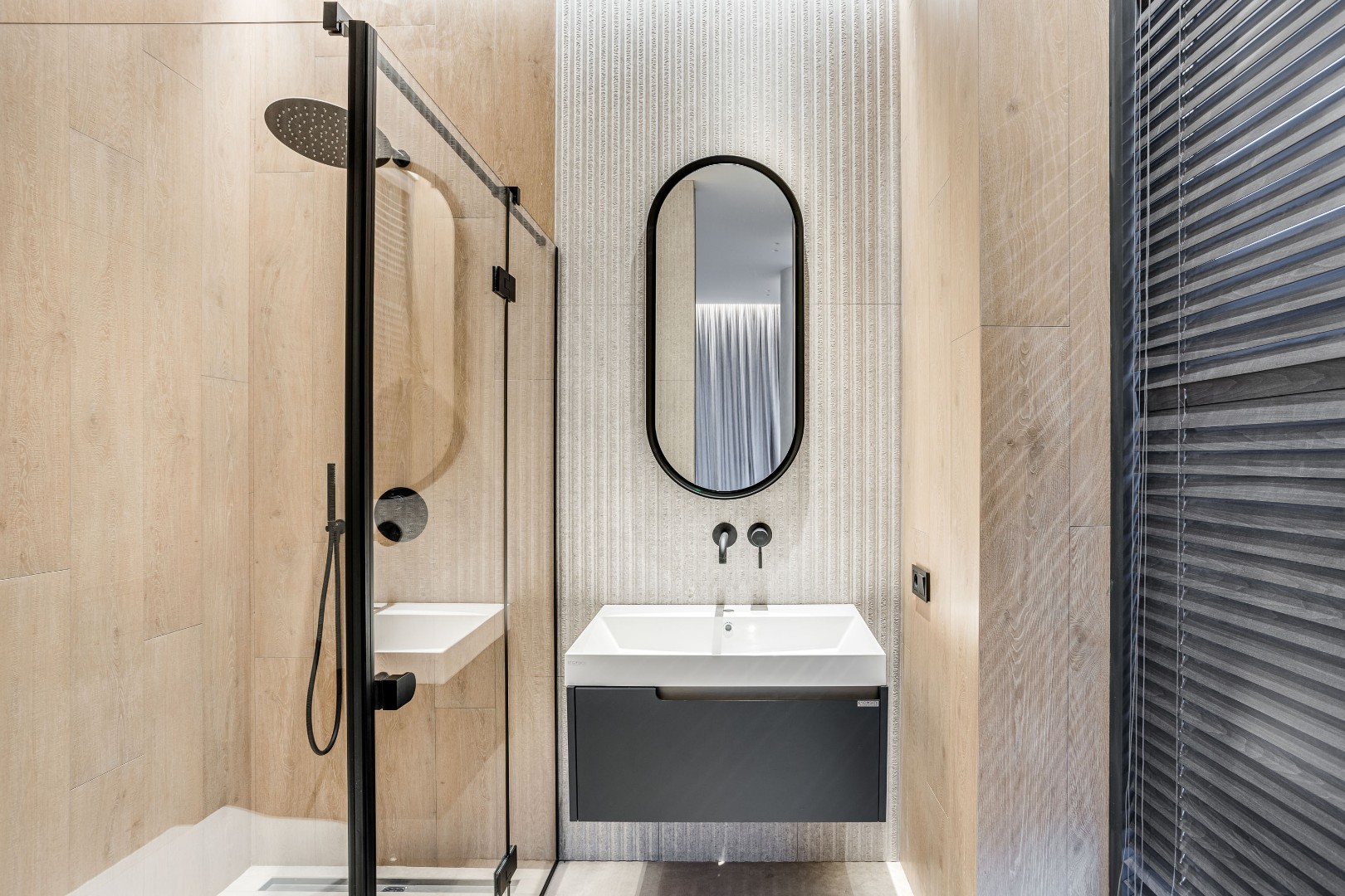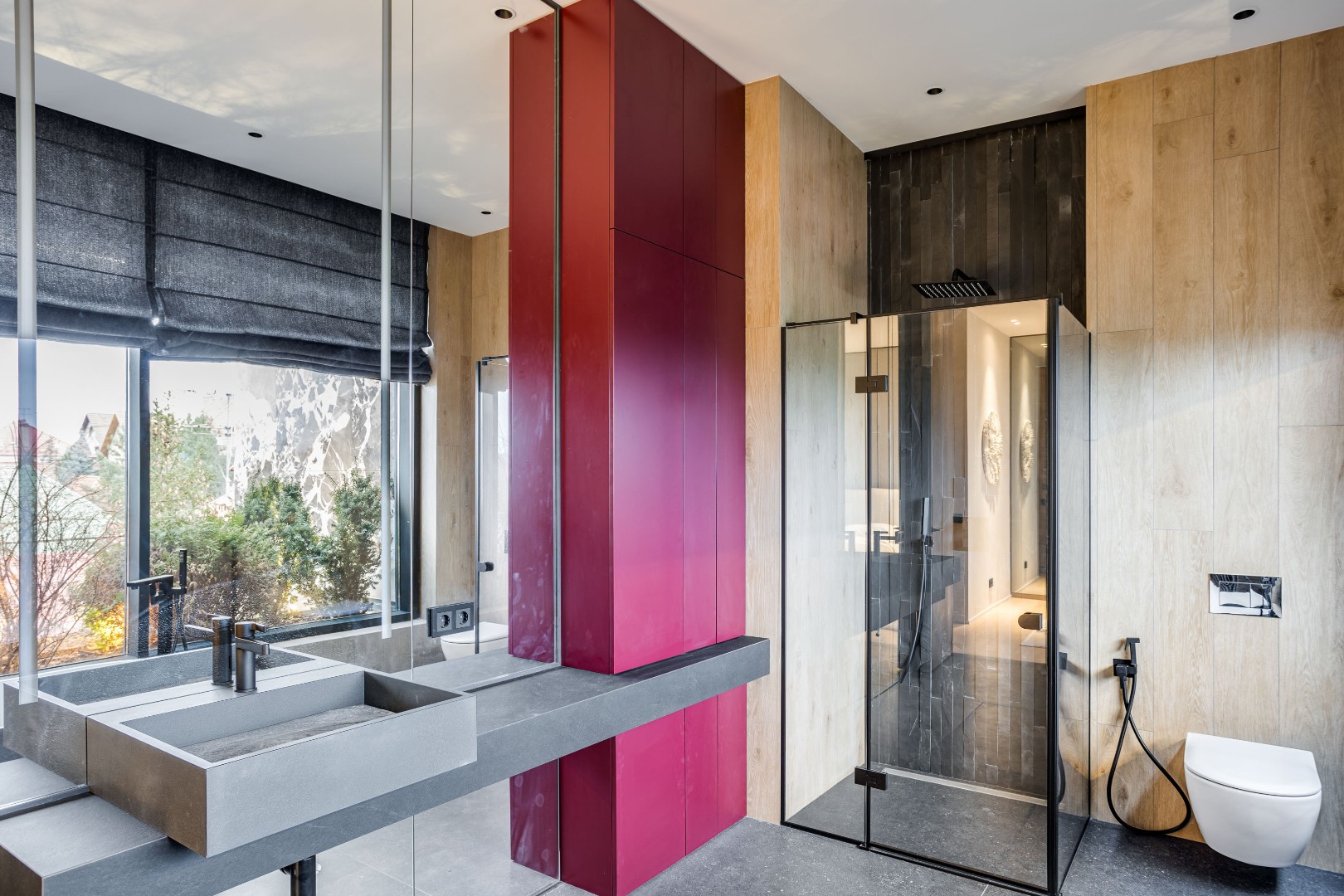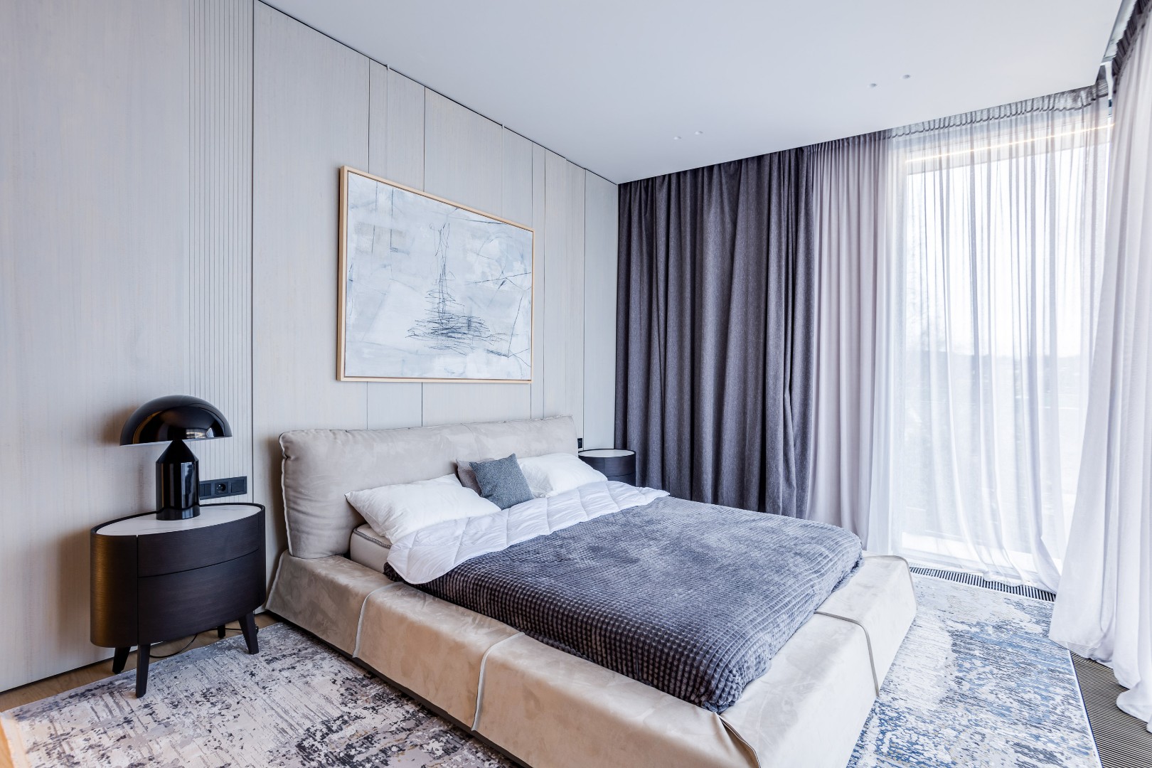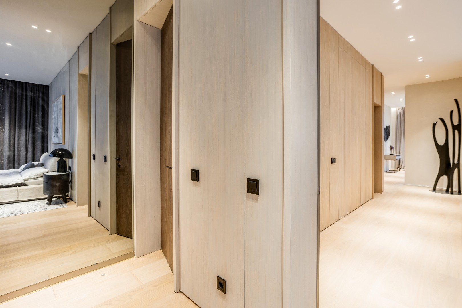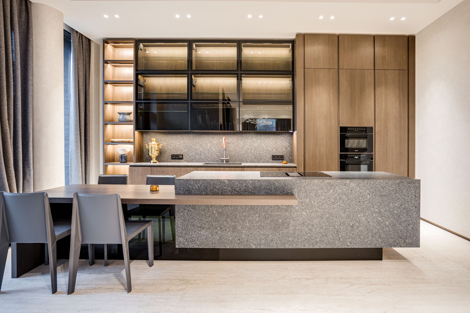 Современный дом площадью 663 м² на участке 12,5 сотки в престижном закрытом посёлке "Усово Плюс". Планировка сочетает открытые светлые зоны для жизни и уединённые приватные пространства. В отделке интерьера использованы преимущественно натуральные материалы: натуральный камень, на стенах панели из шпона и текстиля, фактурная декоративная штукатурка. Из панорамных окон открывается вид на приватный и благоустроенный внутренний двор.