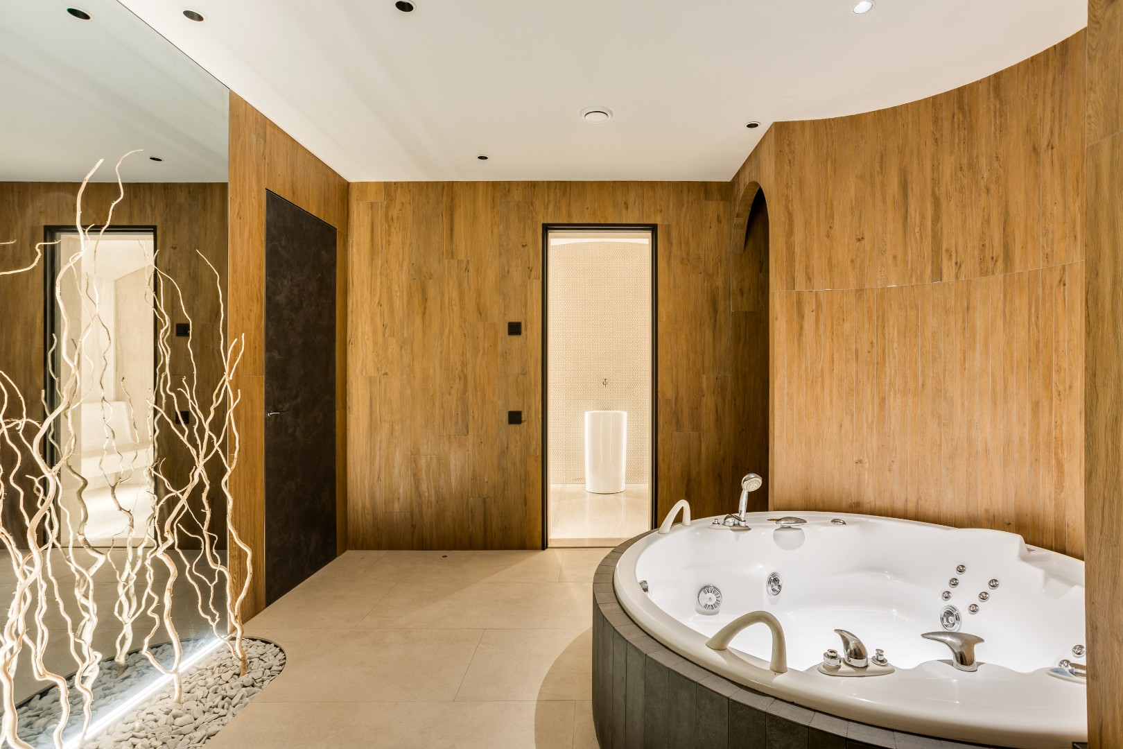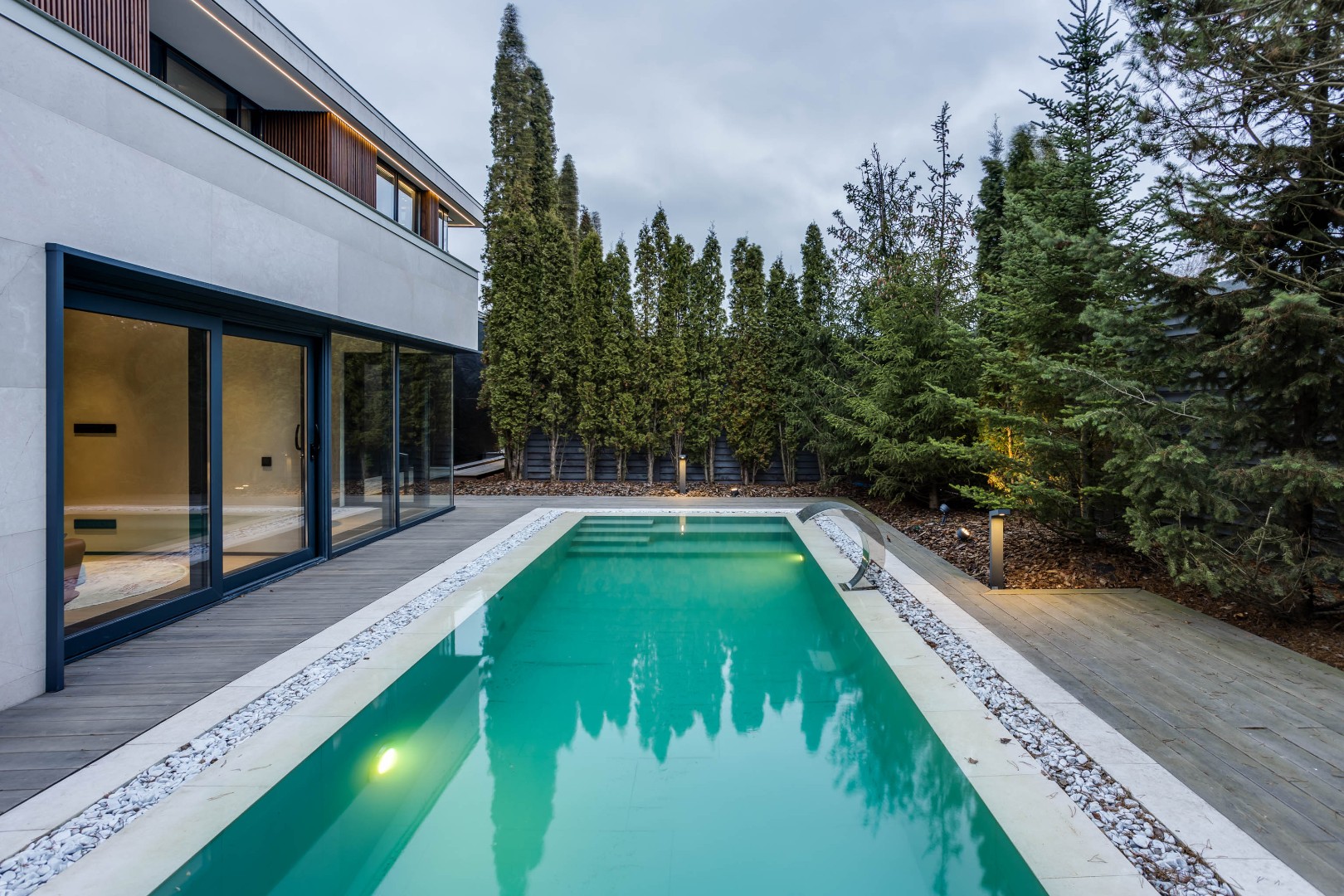 Цоколь: СПА зона включает хаммам, сауну, душевые кабины, Jacuzzi с различными режимами массажа и комнату для переодевания, а также комнату отдыха с выходом к уличному переливному бассейну длиной 8 м с противотоком, подогревом, постирочная, сезонная гардеробная, кинотеатр, комната свободного назначения.