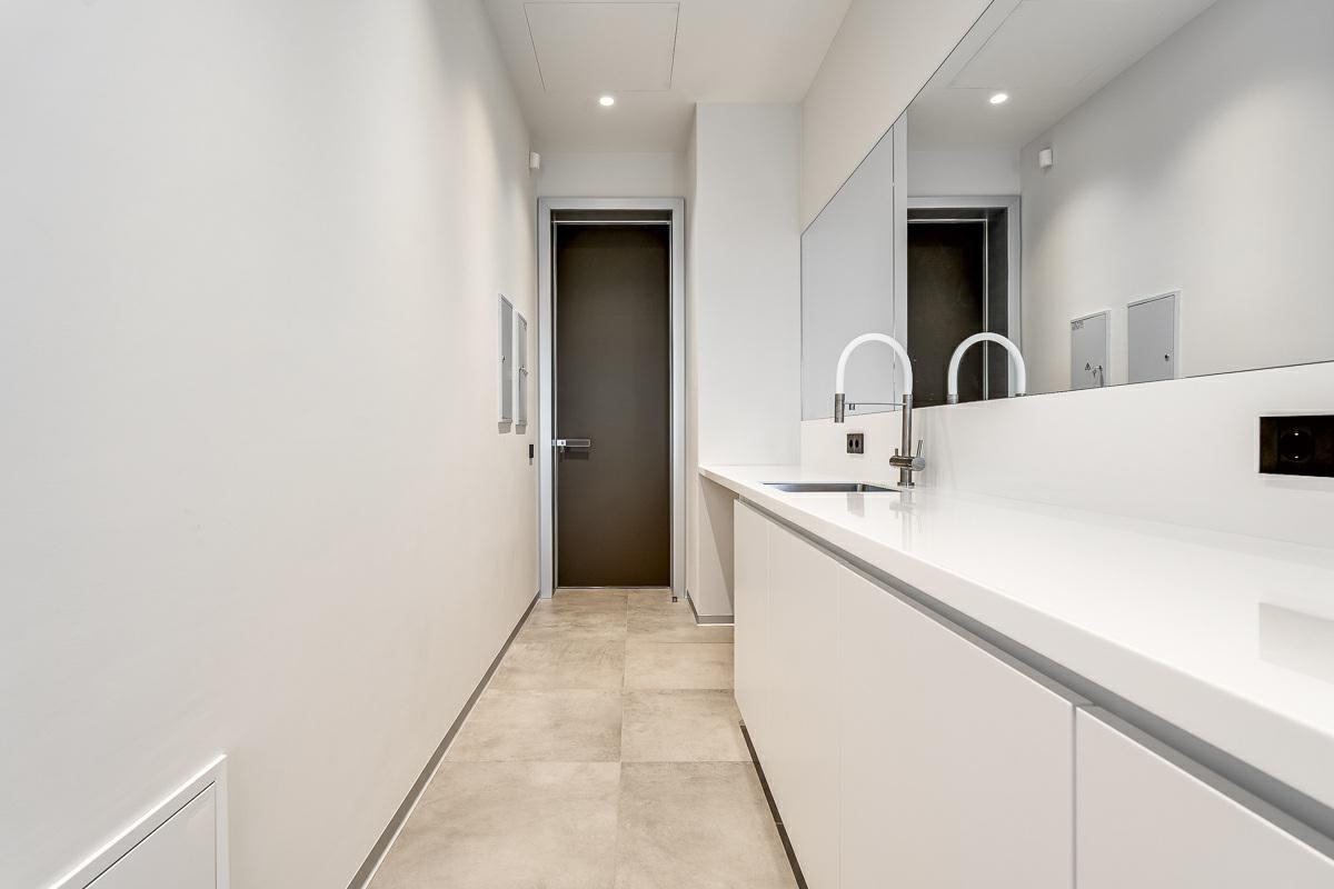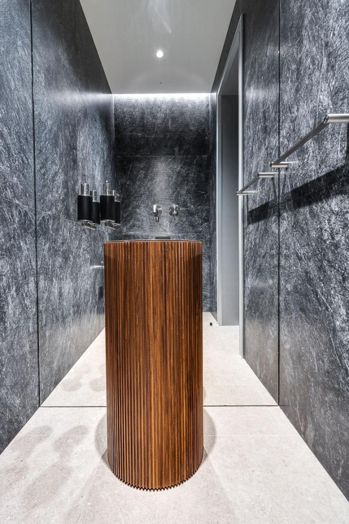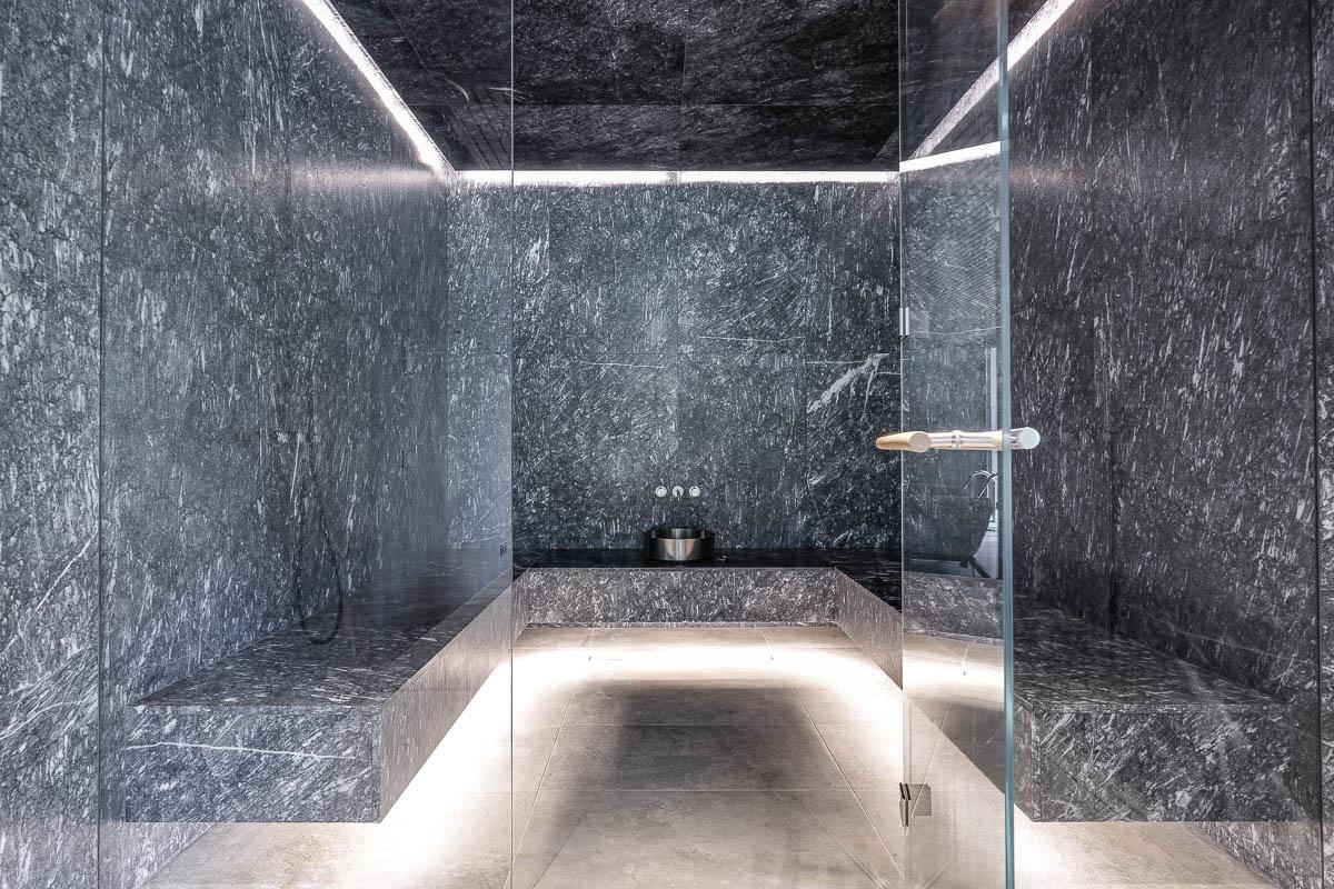 1 этаж: холл, гардеробная, два санузла, котельная, гараж на 2 машиноместа, квартира для персонала, гостиная, кухня, столовая, терраса, рабочая кухня, кабинет, кладовая, бассейн, сауна, душевая, хаммам.