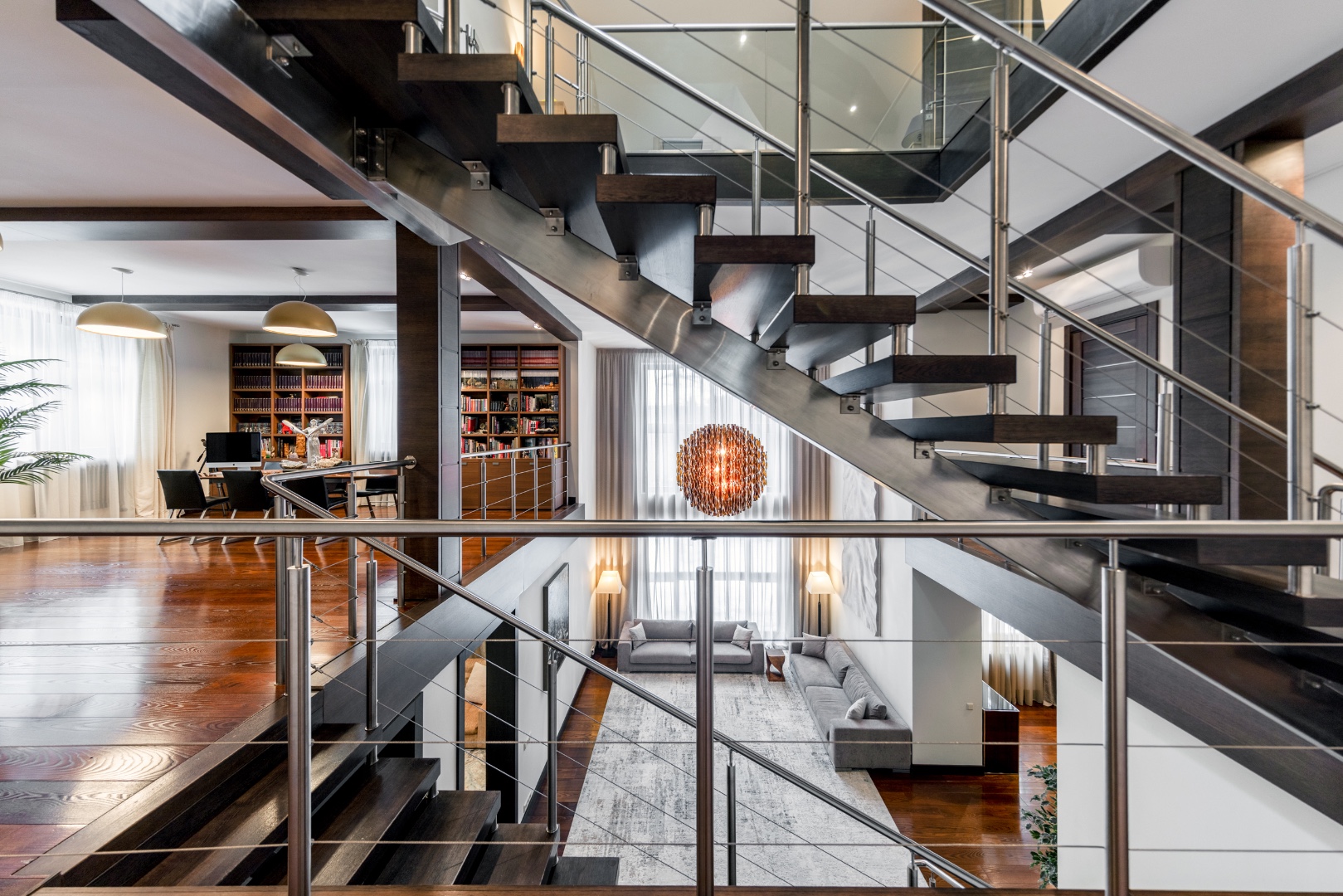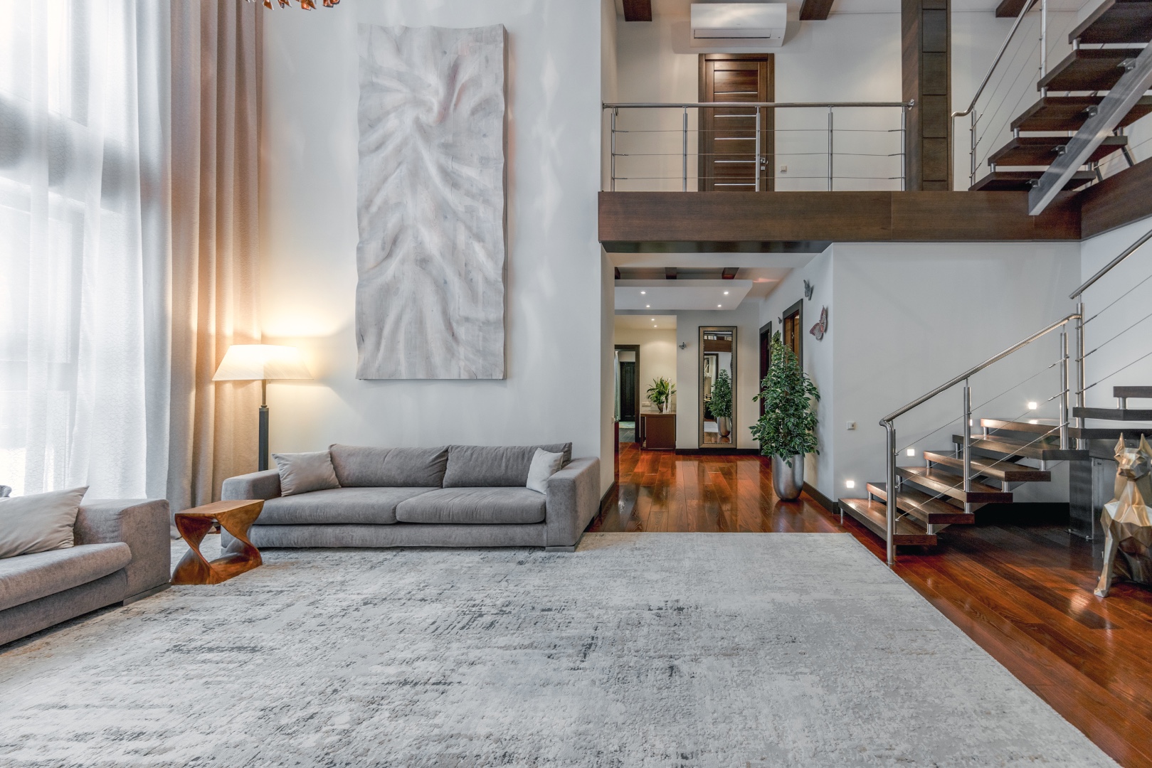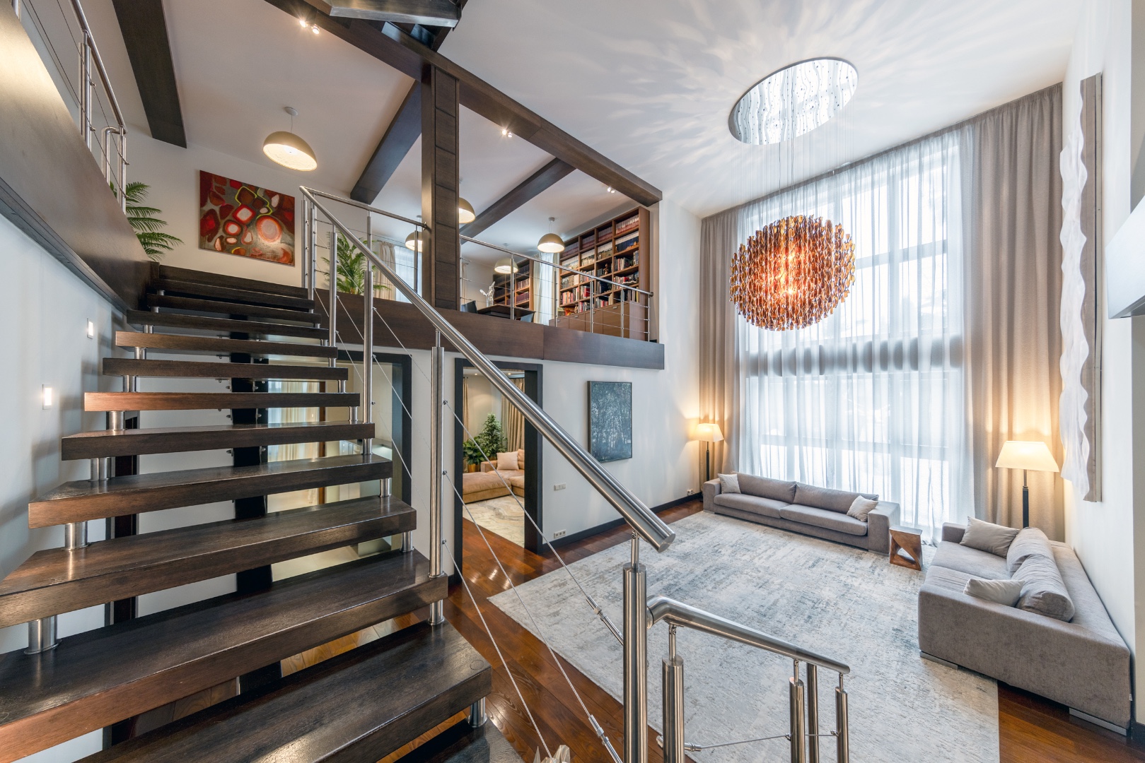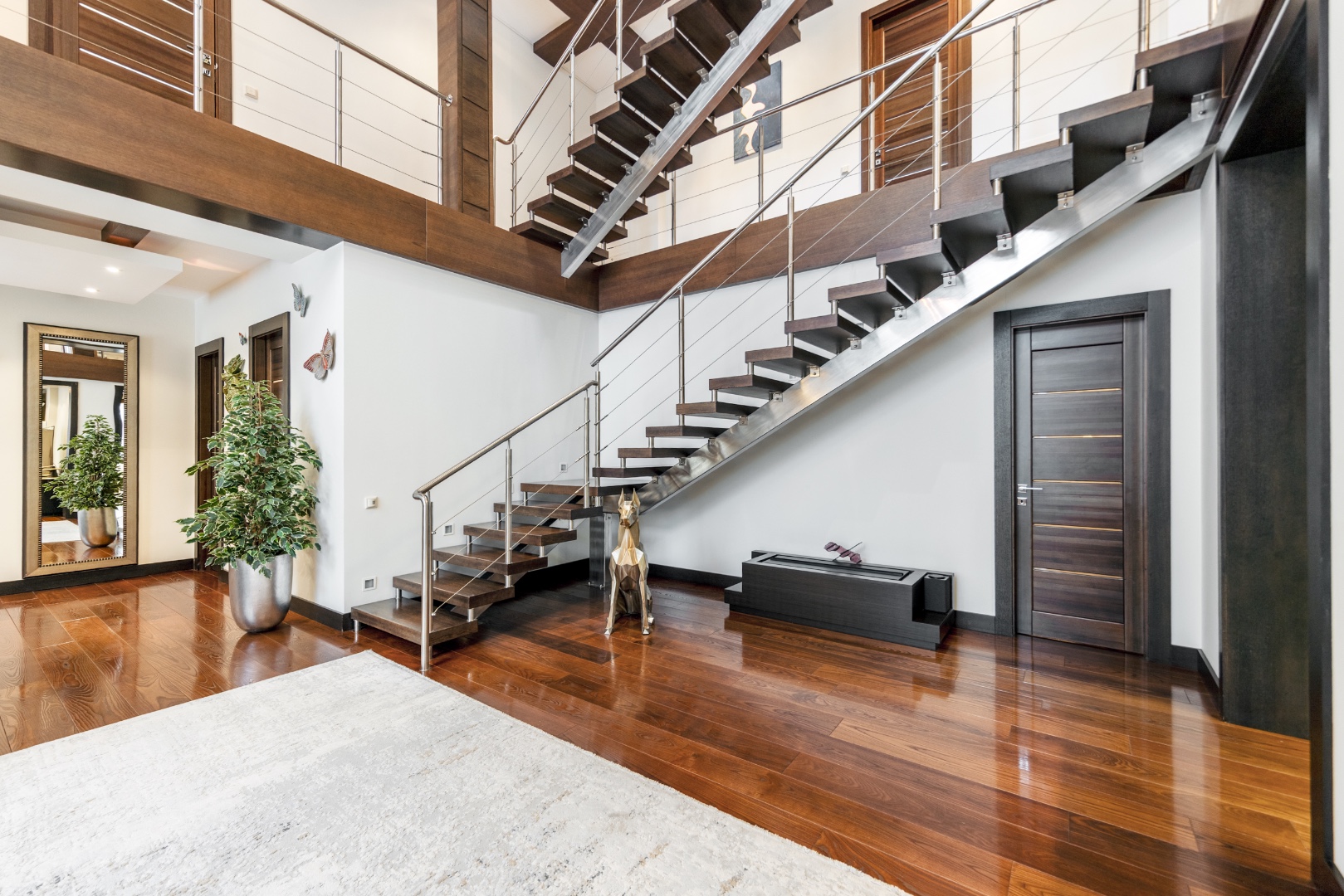 Эффектная «парящая» лестница, подчеркивающая современный стиль.