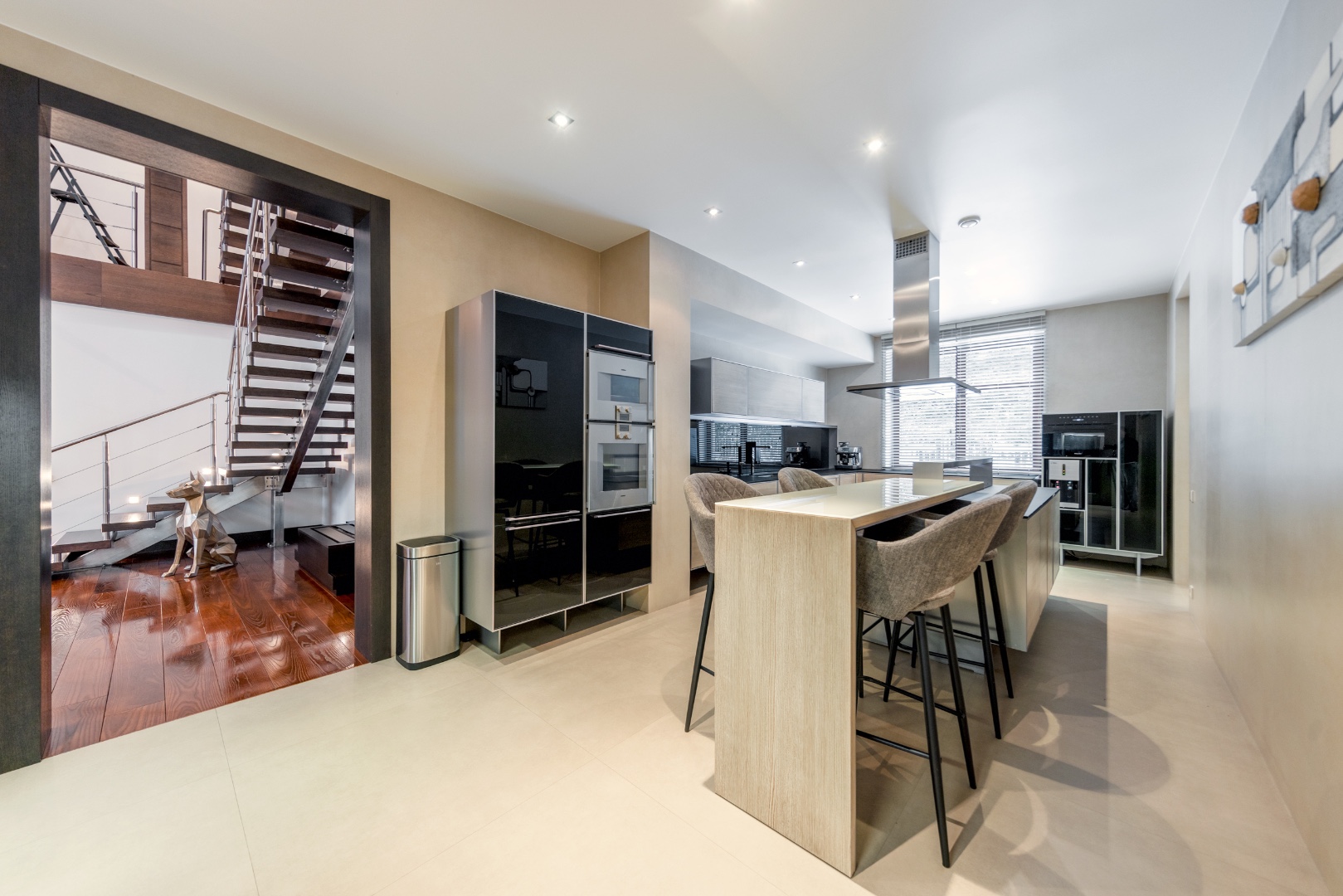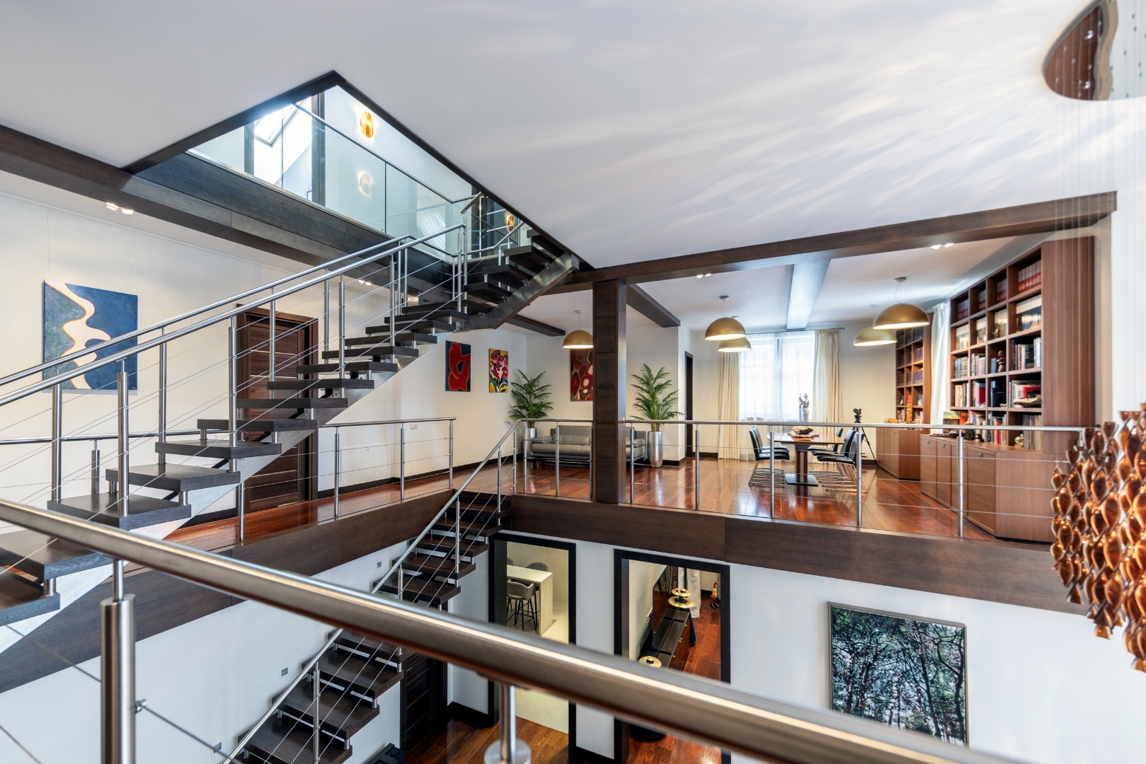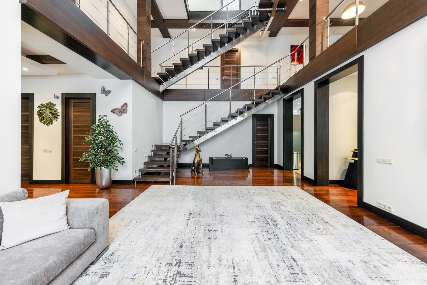 Эффектная «парящая» лестница, подчеркивающая современный стиль.