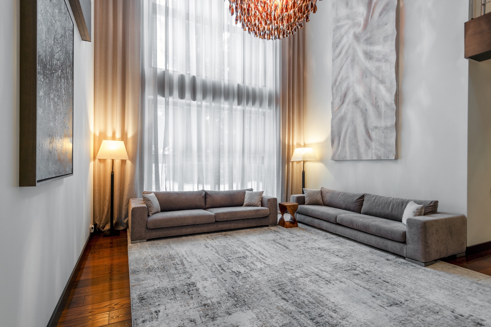 Гостиная с высокими потолками и вторым светом – сердце дома, создающее атмосферу уюта и открытости.