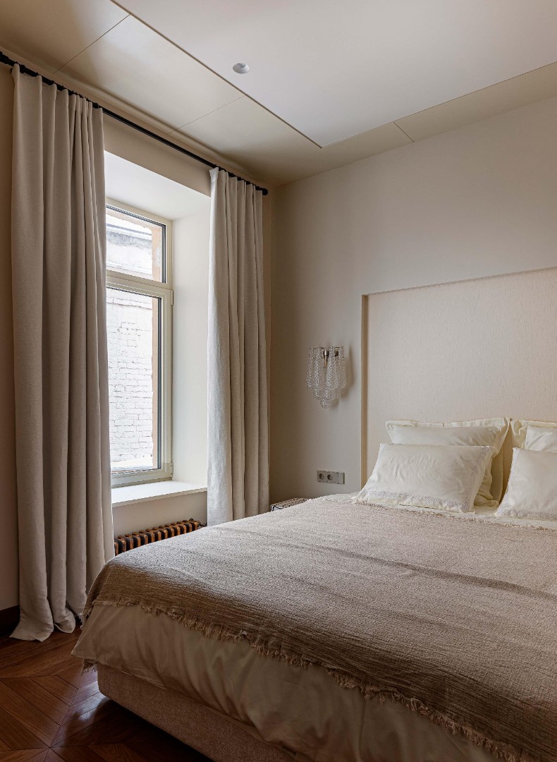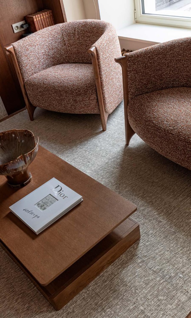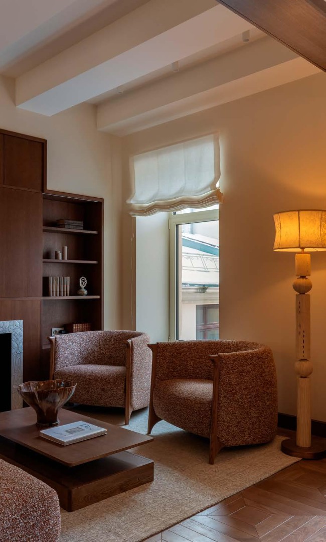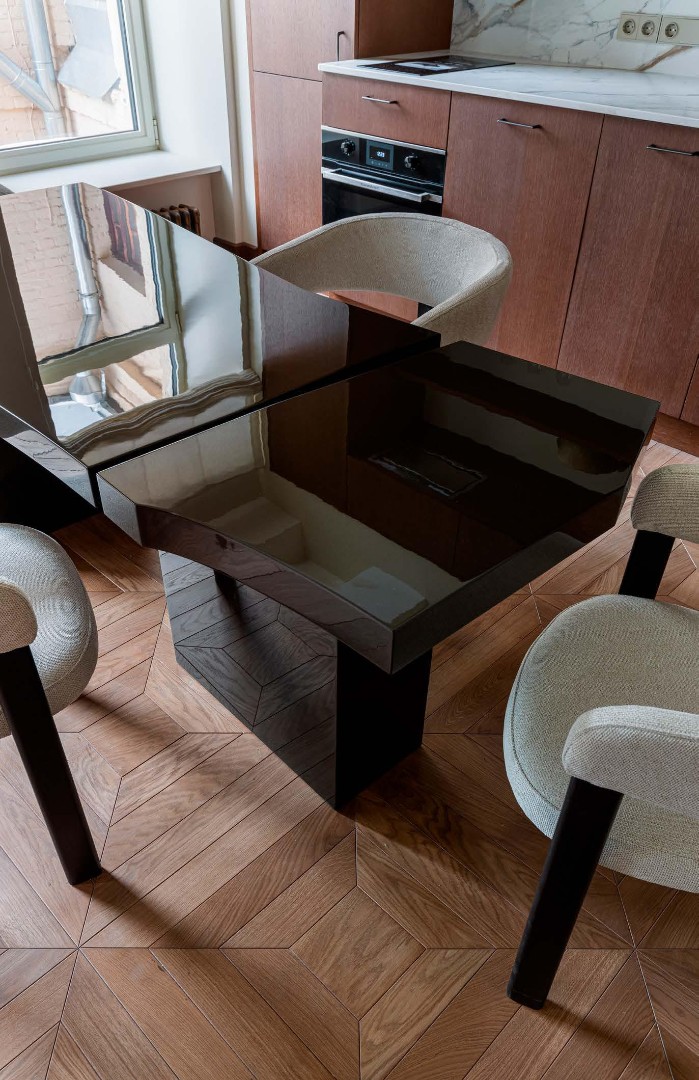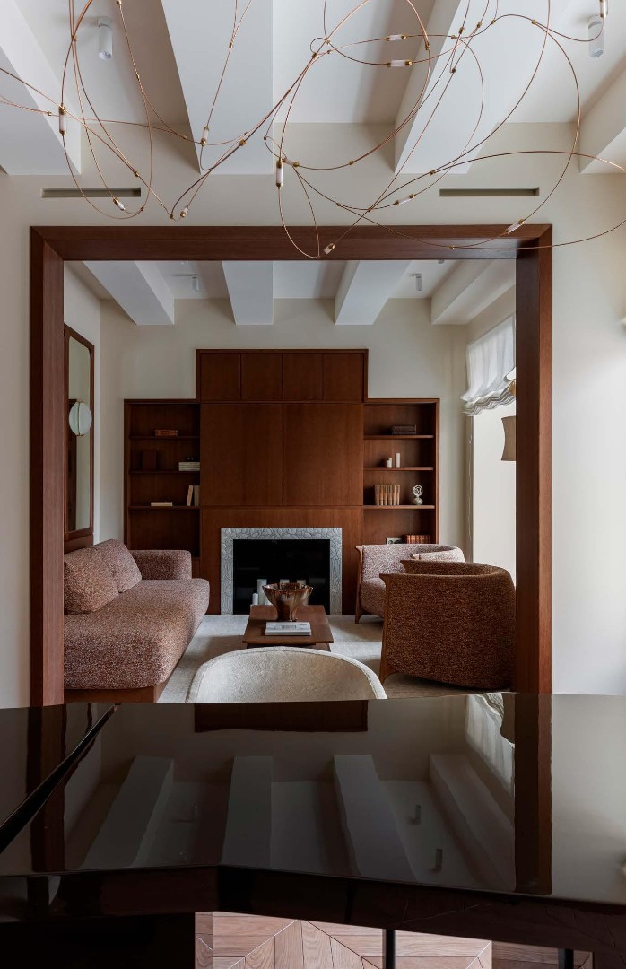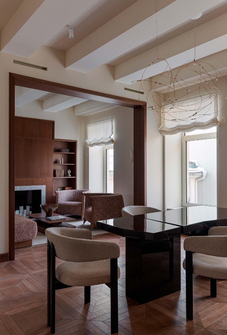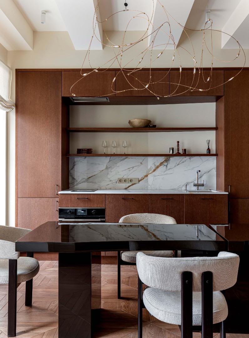 Чистые линии, глубокие фактуры, сценарный свет и безупречно выверенные решения создают пространство, в котором эстетика сочетается с комфортом повседневной жизни. Этот интерьер не спорит с историей дома, а тонко продолжает её, формируя элегантный диалог между эпохами.