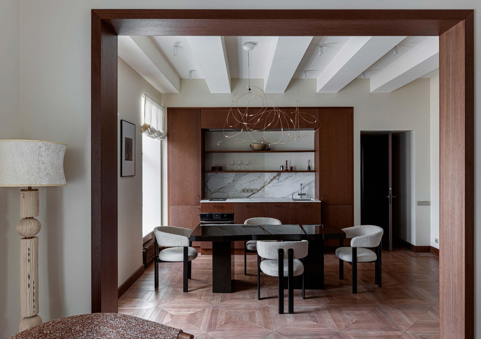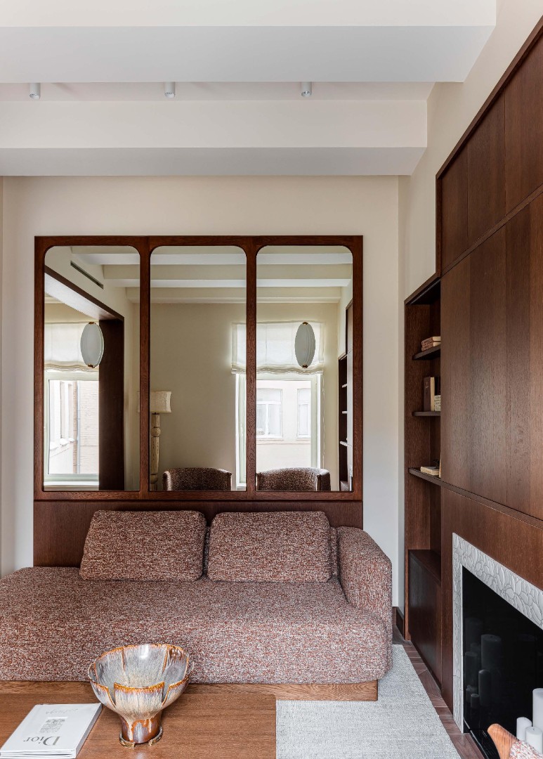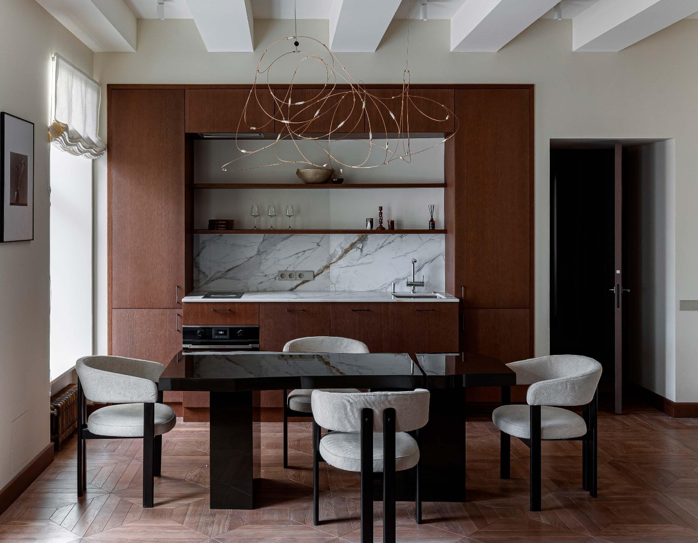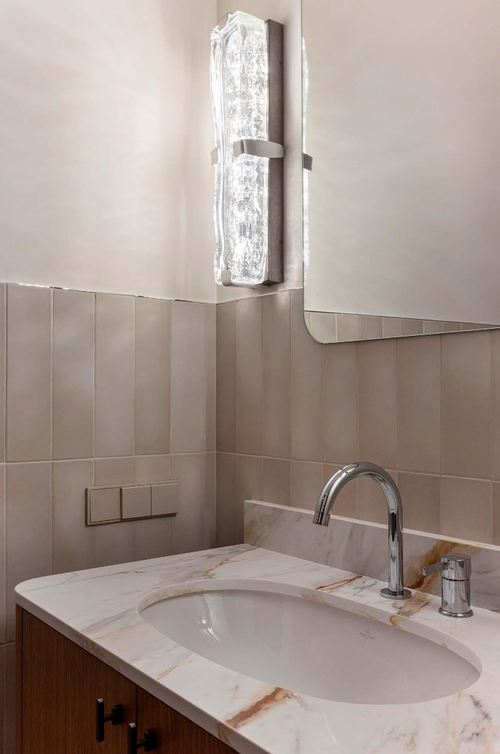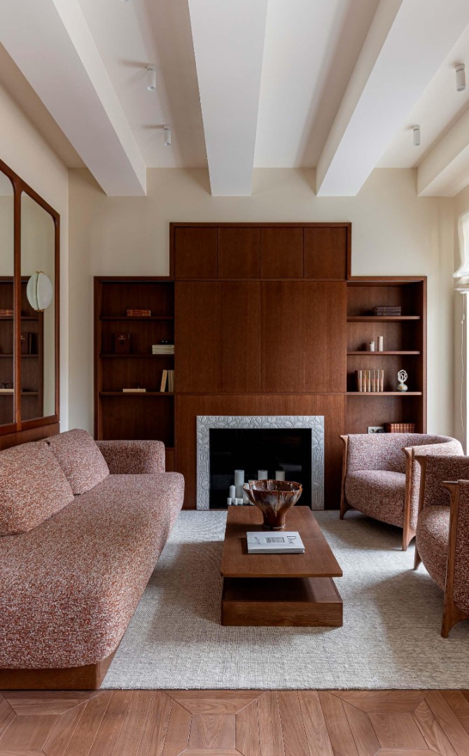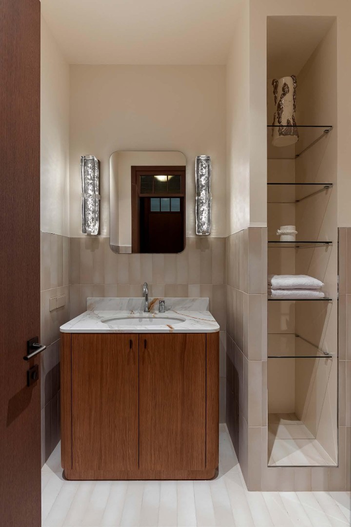 Чистые линии, глубокие фактуры, сценарный свет и безупречно выверенные решения создают пространство, в котором эстетика сочетается с комфортом повседневной жизни. Этот интерьер не спорит с историей дома, а тонко продолжает её, формируя элегантный диалог между эпохами.