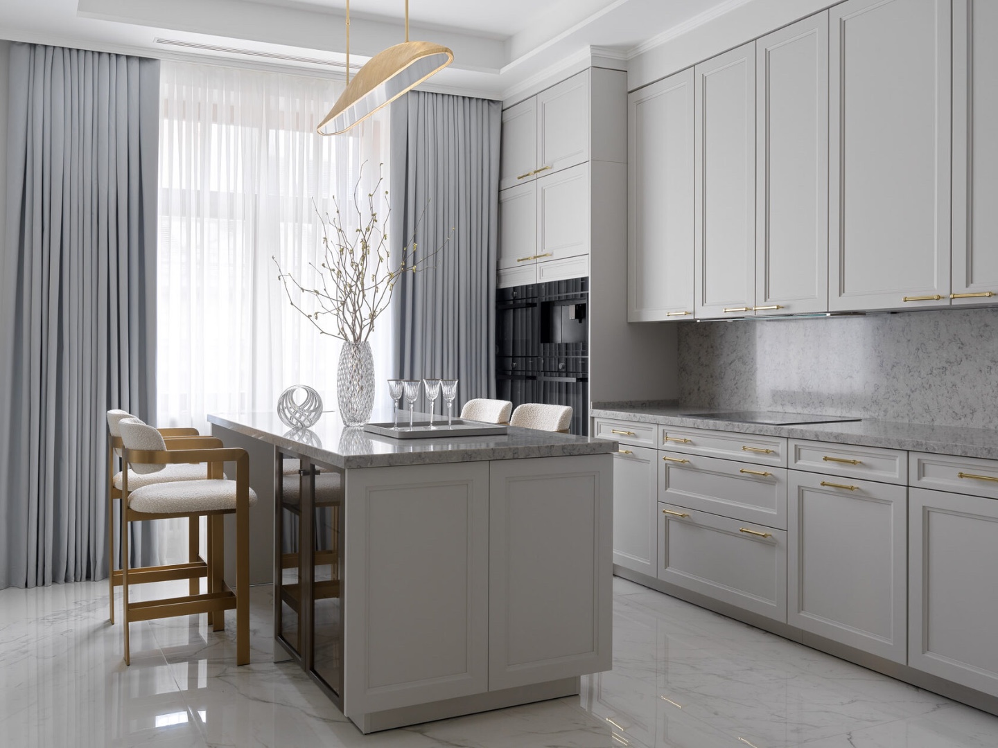 Продуманная планировка включает просторную кухню-столовую, элегантную гостиную, две спальни, кабинет (может использоваться как третья спальня), четыре санузла и четыре гардеробные комнаты.