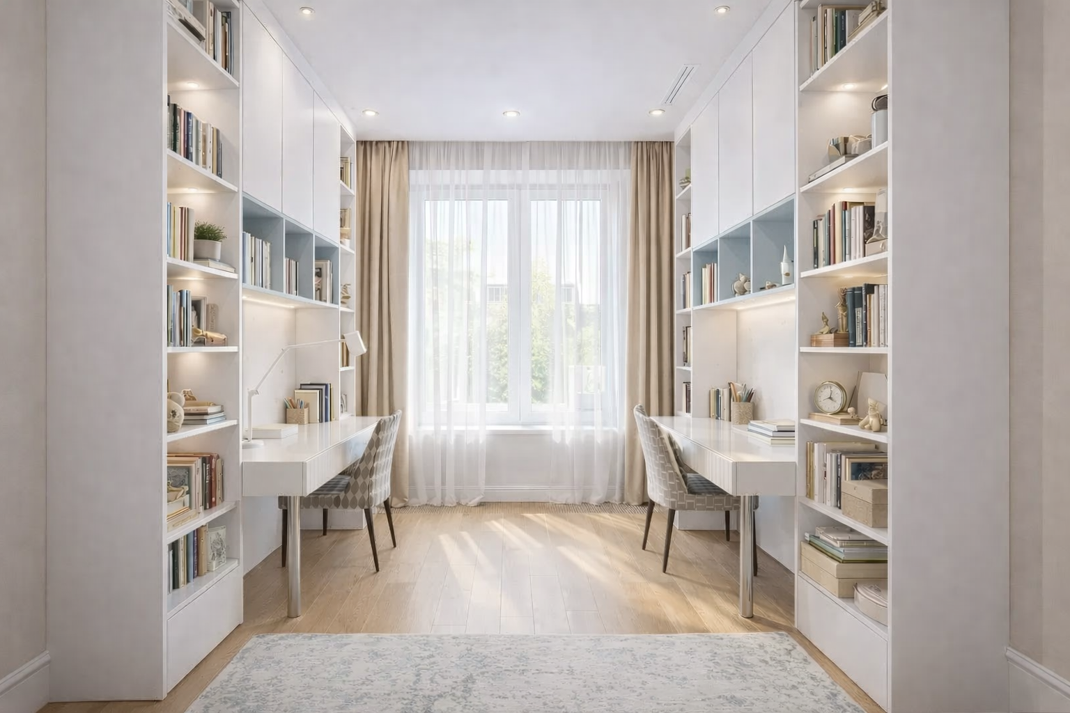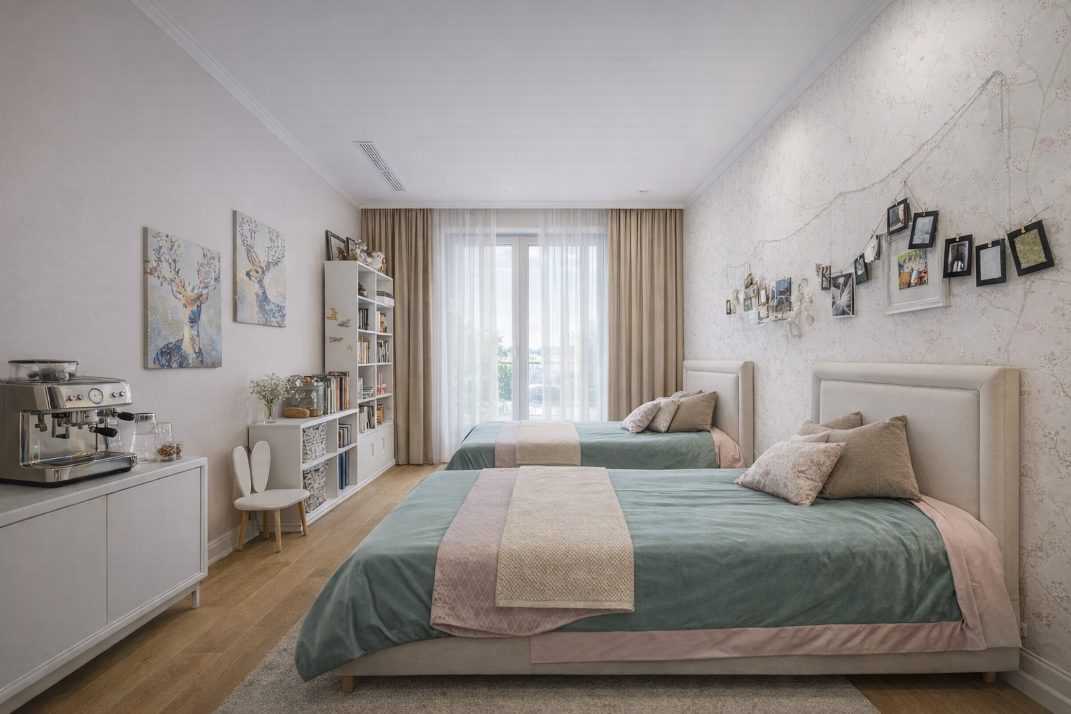 • Два изолированных детских спальни — 14,55 м² и 14,61 м², каждая с собственной гардеробной.