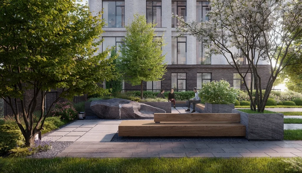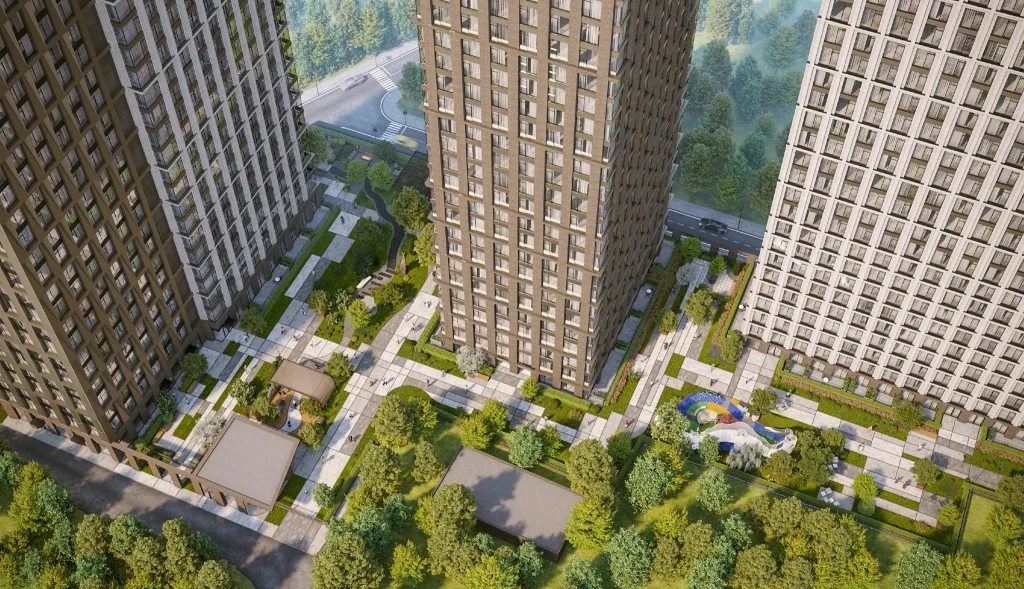 Современная архитектурная концепция здания с панорамным остеклением не только обеспечивает отличные виды, но и идеально вписывается в концепцию района, стекло отражает зелень парков и водную гладь, создавая затейливые переливы. Современный входные группы и дизайнерское лобби гостеприимно встречают гостей и жителей дома. За тишину и спокойствие отвечает эффективное шумоизоляционное остекление. Подземный паркинг поддерживает концепцию «двор без машин».